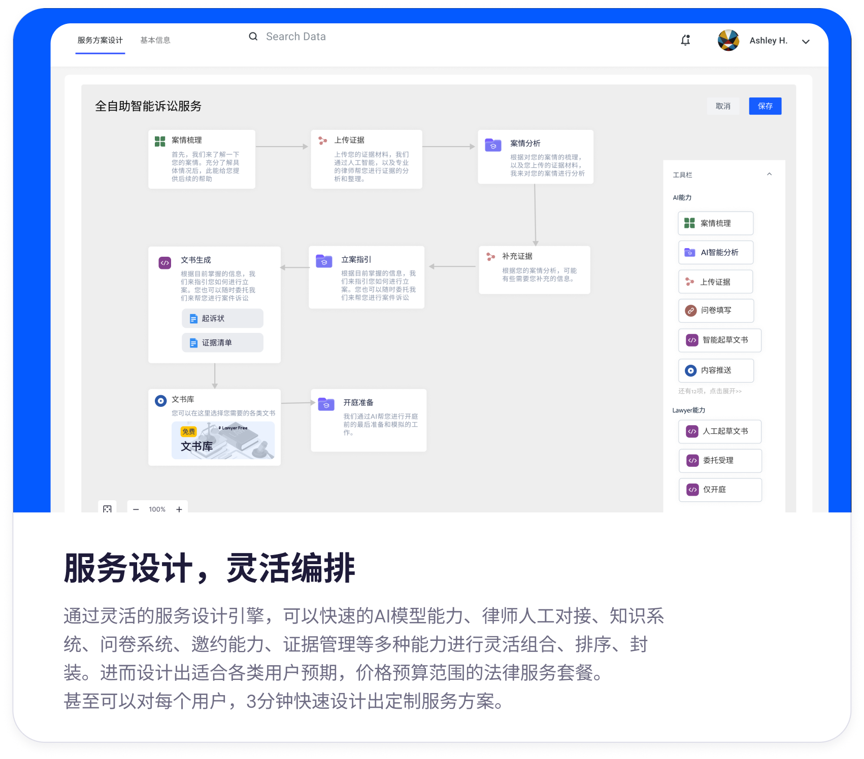法律服务的核心之一在与对当事人的问题是否能有深度的理解,并在各个环节中提供高质量的服务。而非仅限于简单的咨询。因此本次律自由技术架构中,法律服务流程设计引擎是重要的更新。我们将AI在服务节点的能力、律师各项专业能力进行原子化,通过流程引擎进行灵活组合。在律自由的法律专家团可以通过此工具针对客户的案情、标的、预算等等情况灵活组合法律服务方案、设计出合理的服务流程并快速验证和推出更优质的法律服务。